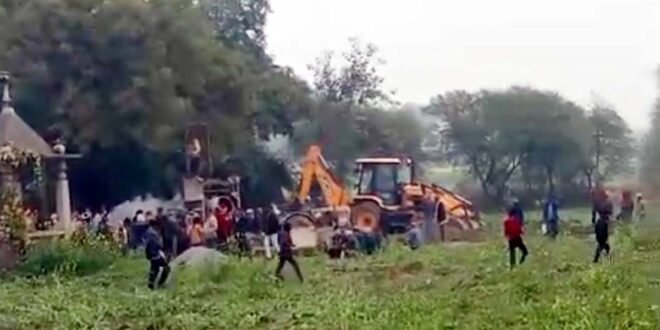 – खेत में जेसीबी चलाकर अवैध कब्जे का प्रयास करते दबंग।