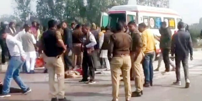 – घटनास्थल पर मौजूद पुलिस बल व भीड़।