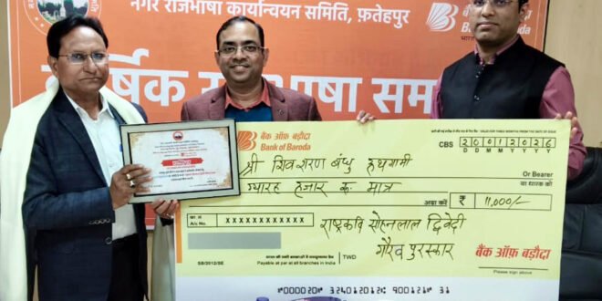 फतेहपुर। नगर राजभाषा कार्यान्वयन समिति फ़तेहपुर द्वारा आयोजित वार्षिक राजभाषा समारोह में कवि एवं शायर शिव शरण बंधु हथगामी को नराकास के मंच से राष्ट्रकवि सोहनलाल द्विवेदी गौरव पुरस्कार से सम्मानित किया गया। अध्यक्ष नराकास एवं क्षेत्रीय प्रमुख बैंक ऑफ बड़ौदा अरविंद कुमार के कर कमलों से पुरस्कार स्वरूप प्रशस्ति पत्र, शाल, वृक्ष एवं 11 हजार का चेक प्रदान किया गया। मुख्य अतिथि श्री बंधु ने नई पीढ़ी का साहित्य और चुनौतियां विषय पर व्याख्यान दिया। कुछ कविताओं का पाठ किया। नराकास फ़तेहपुर के सदस्य सचिव कामाख्या पांडेय के प्रारंभिक उद्बोधन व मुख्य अतिथि के स्वागत एवं परिचय के साथ कार्यक्रम आरंभ हुआ। बैंक ऑफ बड़ौदा फ़तेहपुर क्षेत्र की ई-पत्रिका फतेहपुर संवाद का विमोचन हुआ और प्रतियोगिताओं के विजेताओं को प्रमाण पत्र प्रदान किया गया। इसके बाद मुख्य अतिथि का संबोधन तथा अध्यक्ष नराकास अरविंद कुमार के संबोधन ने उपस्थित सदस्यों का मार्गदर्शन किया। अध्यक्ष ने कहा कि हिंदी की सेवा राष्ट्र की सेवा है। उन्होंने आयोजन की सफलता पर प्रसन्नता व्यक्त की। मुख्य अतिथि कवि एवं शायर शिव शरण बंधु हथगामी ने नई पीढ़ी का साहित्य और चुनौतियां विषय पर बोलते हुए कहा कि नई पीढ़ी का साहित्य समाज में हो रहे तेज बदलाव का प्रतिबिंब है। आज का युवा लेखक अपने अनुभव, विचार और समस्याओं को नई भाषा और नए माध्यमों के जरिए व्यक्त कर रहा है। नई पीढ़ी के साहित्य के सामने कई चुनौतियां भी हैं। सबसे बड़ी चुनौती है पाठकों की घटती रुचि और तेज जीवन शैली के कारण गंभीर साहित्य के लिए समय की कमी। कहा जा सकता है कि चुनौतियों के बावजूद नई पीढ़ी का साहित्य भविष्य की दिशा तय कर रहा है। धन्यवाद ज्ञापन के साथ बैठक समाप्त हुई।