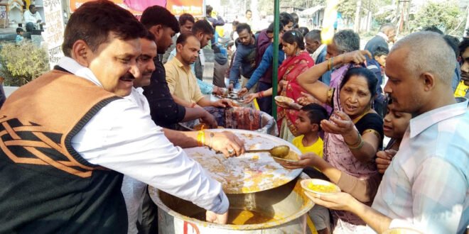 फतेहपुर। जनपद के राधानगर स्थित पावर हाउस के सामने आज श्रद्धा व उल्लास का अद्भुत संगम देखने को मिला। श्री राम मंदिर निर्माण एवं प्राण प्रतिष्ठा के द्वितीय वार्षिकोत्सव के पावन अवसर पर द्विवेदी हार्डवेयर एवं एजीएल टाइल्स के तत्वाधान में एक विशाल भंडारे का भव्य आयोजन किया गया। कार्यक्रम का शुभारंभ भगवान श्री राम के पूजन एवं आरती के साथ हुआ। दोपहर बारह बजे से शुरू हुआ यह भंडारा शाम छह बजे तक निरंतर चलता रहा, जिसमें आसपास के क्षेत्रों से आए भारी संख्या में श्रद्धालुओं ने पूड़ी-सब्जी और बूंदी का प्रसाद ग्रहण कर पुण्य लाभ कमाया। कड़ाके की ठंड के बावजूद भक्तों का उत्साह देखते ही बन रहा था। धार्मिक आयोजन को सकुशल संपन्न कराने में स्थानीय गणमान्य नागरिकों का विशेष सहयोग रहा। मुख्य रूप से कमलाकांत दुबे, मिथिलेश मिश्रा, उमाकांत द्विवेदी, विनय शर्मा एवं चुन्नू (आरा मशीन वाले) ने अपनी सक्रिय भूमिका निभाते हुए व्यवस्थाओं को संभाला। आयोजकों ने बताया कि इस प्रकार के धार्मिक आयोजनों से समाज में समरसता और सेवा भाव का संचार होता है।