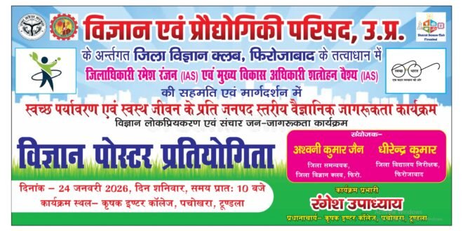 फिरोजाबाद:- विज्ञान एवं प्रौद्योगिकी परिषद उत्तर प्रदेश के अंतर्गत जिला विज्ञान क्लब, फिरोजाबाद के तत्वाधान में जिलाधिकारी फिरोजाबाद रमेश रंजन, मुख्य विकास अधिकारी फिरोजाबाद शत्रोहन वैश्य एवं जिला विद्यालय निरीक्षक फिरोजाबाद धीरेन्द्र कुमार की सहमति एवं निर्देशन में विज्ञान लोकप्रियकरण संचार कार्यक्रम के अंतर्गत स्वच्छ पर्यावरण और स्वस्थ जीवन के प्रति वैज्ञानिक जागरूकता कार्यक्रम का आयोजन कृषक इंटर कॉलेज, पचोखरा, टूंडला में 24 जनवरी 2026 को प्रातः 10 बजे से किया जाएगा। डीआईओएस धीरेंद्र कुमार ने जनपद के सभी बोर्डो के विद्यालयों के प्रधानाचार्यों को निर्देशित किया है कि वे अपने विद्यालय के कक्षा 6, 7, 8, 9 एवं 11 के छात्र एवं छात्राओं को 24 जनवरी 2026 को प्रातः 10 बजे कृषक इंटर कॉलेज, पचोखरा, टूंडला में अपने मार्गदर्शक शिक्षक के साथ प्रतिभाग कराना सुनिश्चित करें। जिला विज्ञान क्लब, फिरोजाबाद के जिला समन्वयक अश्वनी कुमार जैन ने बताया कि इस वैज्ञानिक जागरूकता कार्यक्रम का मुख्य विषय स्वच्छ पर्यावरण और स्वस्थ जीवन है। जिसमें स्वच्छ पर्यावरण और स्वस्थ जीवन पर विषय विशेषज्ञों द्वारा व्याख्यान कार्यक्रम, विज्ञान मॉडल प्रदर्शनी, विज्ञान पोस्टर प्रतियोगिता, विज्ञान नाटिका, विज्ञान शपथ का आयोजन किया जाएगा। विद्यालय के प्रधानाचार्य रंगेश उपाध्याय ने जनपद के सभी बोर्डो के विद्यालयों के प्रधानाचार्यों से अनुरोध किया है कि इस वैज्ञानिक जागरूकता कार्यक्रम में विद्यार्थियों को समय से प्रतिभाग कराकर उनके वैज्ञानिक दृष्टिकोण में वृद्धि करें।