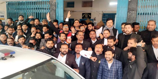 – कलेक्ट्रेट में हल्ला बोल करते अधिवक्ता।