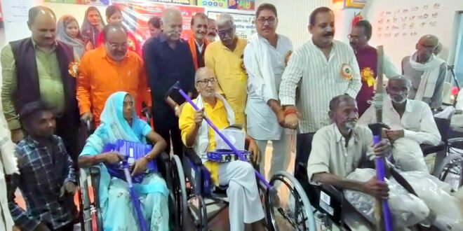 बुजुर्गों को उपकरण वितरित करते पूर्व मंत्री रणवेन्द्र प्रताप सिंह।