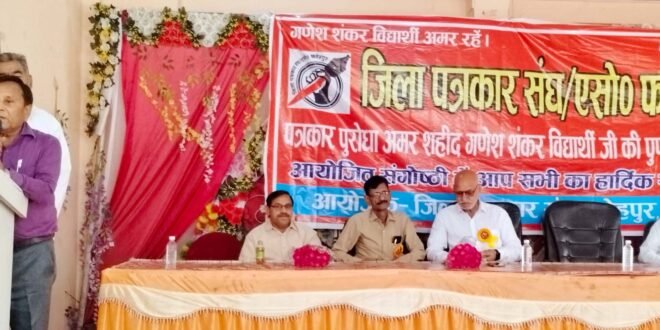 फतेहपुर। जिला पत्रकार एसोसिएशन संघ के पत्रकार साथियों ने अमर शहीद, स्वतंत्रता सेनानी, पत्रकार पुरोधा पण्डित गणेश शंकर विद्यार्थी जी की 95वीं पुण्यतिथि जनपद के बिन्दकी तहसील के बकेवर कस्बे में एक गेस्ट हाउस में मनाई। कार्यक्रम का शुभारंभ प्रियंका अग्रवाल उप जिलाधिकारी बिन्दकी व अजय सिंह भदौरिया अध्यक्ष जिला पत्रकार एसोसिएशन संघ फतेहपुर ने दीप प्रज्वलन कर विद्यार्थी जी की फोटो में माल्यार्पण कर किया। संगोष्ठी की अध्यक्षता वरिष्ठ पत्रकार कामता तिवारी ने किया और जिला कमेटी के वरिष्ठ उपाध्यक्ष विमलेश त्रिवेदी ने संचालक की भूमिका निभाते हुए कार्यक्रम को रोचक बनाया। कार्यक्रम में मुख्य अतिथि के रूप में मौजूद प्रियंका अग्रवाल उप जिला अधिकारी बिंदकी ने विद्यार्थी जी की जीवनी पर प्रकाश डाला तथा कहा कि बुराई को दूर करने और समाज में सृजनात्मक भावना बढ़ाने में पत्रकारिता अहम हिस्सा है।अन्य वक्ताओं रवीन्द्र त्रिपाठी, अरुण द्विवेदी आदि सभी पत्रकार साथियों को निष्पक्ष पत्रकारिता करने के गुण सिखाई गए। कार्यक्रम में करीब एक सैकड़ा पत्रकार साथियों के साथ समाजसेवियों, डॉक्टर, शिक्षकों ने भी हिस्सा लिया। कार्यक्रम के दौरान सम्मान समारोह का भी आयोजन किया गया जिसमें समाज में अच्छे कार्य कर रहे लोगों व पत्रकार साथियों को सम्मानित किया गया। अंत में जलपान कर कार्यक्रम का समापन किया गया। कार्यक्रम में संगठन के सदर, खागा, बिन्दकी तहसील के पत्रकार साथियों के साथ साथ अन्य पत्रकार साथियों ने बढ़ चढ़कर भाग लिया तथा अपने अपने विचार साझा किए। कार्यक्रम में मुख्य रूप से अजय सिंह भदौरिया अध्यक्ष, वसीम अख्तर संरक्षक, विमलेश त्रिवेदी वरिष्ठ उपाध्यक्ष , रईस उद्दीन उपाध्यक्ष, अवनीश सिंह चौहान मंत्री, धीरेन्द्र वाजपेई खागा तहसील अध्यक्ष, निरंजन सिंह खागा तहसील महामंत्री, शैलेष सिंह सदर तहसील अध्यक्ष, आशीष सिंह सदर तहसील महामंत्री, नरसिंह संयुक्त मंत्री, शैलेन्द्र बिंदकी तहसील अध्यक्ष, राजेन्द्र सोनी महामंत्री बिन्दकी तहसील, ललित मिश्रा संरक्षक बिन्दकी तहसील सहित तमाम पत्रकार साथी मौजूद रहे।