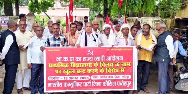 खागा, फतेहपुर। भारतीय कम्युनिस्ट पार्टी जिला काउंसिल ने अपने प्रांतीय व राष्ट्रीय आवाहन पर एक दिवसीय धरना प्रदर्शन करके जनता की मूल समस्याओं का आठ सूत्रीय ज्ञापन एसडीम खागा के माध्यम से राज्यपाल को भेजा गया। ज्ञापन में उत्तर प्रदेश सरकार द्वारा प्राथमिक विद्यालयों को छात्र संख्या के आधार पर बंद करने का विरोध किया गया जिसमें 6 से 14 साल तक के बच्चों जिन्हें शिक्षा का मौलिक अधिकार प्राप्त है। उन्हें यह सरकार शिक्षा से वंचित करना चाहती है। दूसरी ओर केंद्र सरकार द्वारा बांग्ला भाषी लोगों को भाषा के नाम पर परेशान कर रही है। बंगाली भाषा को विदेशी भाषा बताकर भाईचारा को बिगाड़ा जा रहा है जबकि बांग्ला भाषा भारतीय भाषाओं में से एक है। ज्ञापन में मांग की गई कि उत्तर प्रदेश सरकार द्वारा सात संख्या का बहाना बनाकर स्कूलों को बंद करने का आदेश वापस लिया जाए। विद्यालय में चार संख्या बढ़ाना उसमें गुणवत्ता बढ़ाना जिम्मेदारी सरकार की है। शिक्षा के मौलिक अधिकार को पूर्णतया लागू किया जाए। बाल मजदूरी रोकी जाए। नई शिक्षा नीति 2020 वापस ली जाए। शिक्षा का बजट बढ़ाया जाए और शिक्षा को अनिवार्य रूप से मुक्त किया जाए। बांग्ला भाषा को विदेशी बताने जैसे शर्मनाक कृत्य को रोका जाए। उत्तर प्रदेश में फतेहपुर सहित तमाम जिलों में सांप्रदायिक स्वभाव बिगड़ना मंदिर मस्जिद मकबरा के नाम पर हो रही सांप्रदायिक अराजकता को रोकते हुए इसके दोषियों को सख्त से सख्त कानूनी कार्रवाई की जाए। ज्ञापन देने वालों में जिला सचिव कामरेड राम प्रकाश, सह सचिव पूरनलाल, कामरेड रामकृष्ण हेगडे, कोषाध्यक्ष सुमन सिंह चौहान, कामरेड मोतीलाल एडवोकेट, कामरेड फूलचंद पाल, अमित रामचंद्र, राधेरमण पांडेय, छोटेलाल, कयामुद्दीन, नेम सिंह एडवोकेट, राम सुमेर सिंह एडवोकेट, शिवनारायण साहू, मूलचंद, हरिश्चंद्र, चंद्रशेखर सिंह, खुर्शीद अहमद, ज्ञानेंद्र सिंह, गढ़वा के जगन्नाथ सहित सैकड़ो कार्यकर्ता मौजूद रहे।