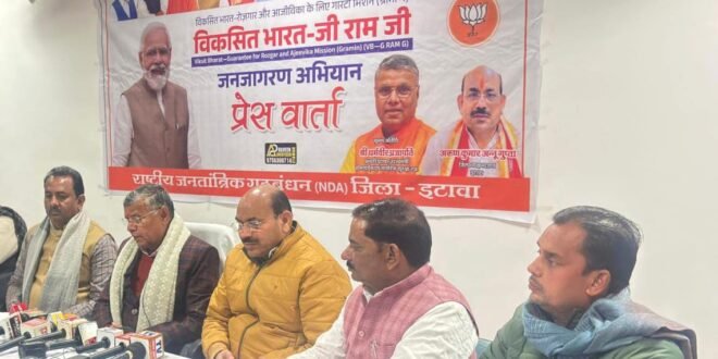 इटावा। लोकसभा में प्रस्तुत किए गए नए ग्रामीण रोजगार कानून “विकसित भारत: जी राम जी (वीबी–जी राम जी) अधिनियम 2025” को लेकर जनपद इटावा में सिंचाई विभाग गेस्ट हाउस में एक महत्वपूर्ण प्रेस वार्ता का आयोजन किया गया। प्रेस वार्ता को होमगार्ड, नागरिक सुरक्षा एवं जनपद इटावा के प्रभारी मंत्री श्री धर्मवीर प्रजापति ने भारतीय जनता पार्टी जिलाध्यक्ष श्री अरुण कुमार ‘अन्नू’ गुप्ता की उपस्थिति में संबोधित किया। प्रभारी मंत्री ने कहा कि यह अधिनियम ग्रामीण भारत को आत्मनिर्भर, आधुनिक एवं विकास की मुख्यधारा से जोड़ने की दिशा में एक ऐतिहासिक पहल है। उन्होंने स्पष्ट किया कि महात्मा गांधी राष्ट्रीय ग्रामीण रोजगार गारंटी योजना (मनरेगा) को समाप्त नहीं किया गया है। वीबी–जी राम जी अधिनियम के पूर्ण रूप से लागू होने तक मनरेगा पूर्व की भांति प्रभावी रहेगी और रोजगार की गारंटी बनी रहेगी। उन्होंने बताया कि मनरेगा की तुलना में वीबी–जी राम जी अधिनियम के अंतर्गत रोजगार गारंटी 100 दिनों से बढ़ाकर 125 दिन कर दी गई है। यदि निर्धारित समय में रोजगार उपलब्ध नहीं कराया जाता है तो बेरोजगारी भत्ता देना अनिवार्य होगा। इस योजना के अंतर्गत ग्राम पंचायत स्तर पर स्थानीय आवश्यकताओं के अनुसार योजनाओं का निर्माण किया जाएगा। गांवों के समग्र विकास के लिए प्रधानमंत्री गतिशक्ति योजना सहित भौगोलिक सूचना प्रणाली जैसे आधुनिक तकनीकी उपकरणों का उपयोग किया जाएगा तथा अन्य विभागीय योजनाओं से समन्वय स्थापित किया जाएगा। अनुमन्य कार्यों को चार प्रमुख श्रेणियों में विभाजित किया गया है— जल सुरक्षा एवं संरक्षण कार्य, ग्रामीण अवसंरचना से संबंधित कार्य, आजीविका संवर्धन के कार्य, जलवायु परिवर्तन एवं प्रतिकूल मौसम से निपटने से जुड़े कार्य। विकास के मानकों के आधार पर ग्राम पंचायतों को ‘ए’, ‘बी’ एवं ‘सी’ श्रेणी में विभाजित किया जाएगा, जिससे सभी गांवों को समान विकास के अवसर मिल सकें। कृषि बुवाई एवं कटाई के समय श्रमिकों की कमी न हो, इसके लिए वर्ष में 60 दिनों तक कृषि मौसम में कार्य न कराने का प्रावधान भी किया गया है।