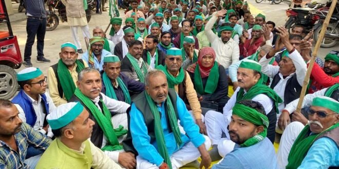 – कलेक्ट्रेट गेट के बाहर धरना देते भाकियू टिकैत गुट के पदाधिकारी।