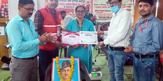 फतेहपुर। इंडियन रेडक्रॉस सोसाइटी व प्राथमिक शिक्षक संघ हसवा के संयुक्त तत्वाधान व चेयरमैन डॉ अनुराग श्रीवास्तव के नेतृत्व में शहीद ए आजम सरदार भगत सिंह जी की जयंती व विश्व हृदय दिवस पर हसवा ब्लाक संसाधन केंद्र में रक्तदान शिविर व डेंगू बचाव महाभियान चलाया।