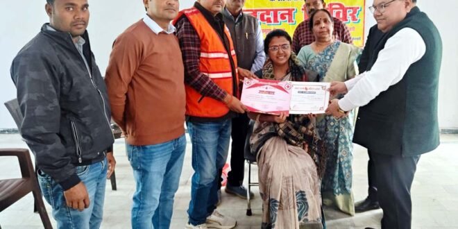 – रक्तदाता को प्रशस्ति पत्र देकर उत्साहवर्धन करते सीएमओ।
