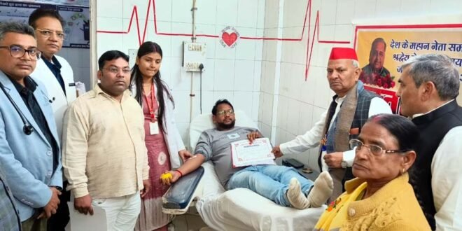 फतेहपुर। देश के पूर्व रक्षामंत्री एवं उत्तर प्रदेश के पूर्व मुख्यमंत्री नेताजी मुलायम सिंह यादव के जन्मदिन पर रक्तदान शिविर का आयोजन किया गया। जिसमें एक दर्जन लोगों ने रक्तदान कर ज्यादा से ज्यादा रक्तदान कर दूसरों का जीवन सुरक्षित बनाने की अपील की। रक्तदान शिविर का आयोजन सर्व फार ह्यूमैनिटी फाउंडेशन के सहयोग से किया। शिविर का उद्धघाटन सांसद नरेश उत्तम पटेल व नगर पालिका चेयरमैन राजकुमार मौर्य एडवोकेट व विशिष्ट अतिथि केतकी यादव ने फीता काटकर किया। शिविर का आयोजन फूल सिंह मौर्य के नेतृत्व में हुआ। जिसमें बारह रक्तदाताओं ने रक्तदान किया। रक्तदान करने वालों में तनवीर हुसैन, प्रद्युम कुमार, धनराज कुमार, फूल सिंह मौर्य, दिग्विजय सिंह, प्रभाकर मौर्य, कमलेश पटेल, दीपक कुमार, राजेश कुमार, नूर मोहम्मद, नरेश कुमार गुप्ता, दिग्विजय शामिल रहे। इस मौके पर संस्था सर्व फॉर ह्यूमैनिटी फाउंडेशन से गुरमीत सिंह, जिला चिकित्सालय रक्तकेन्द्र से मुख्य चिकित्सा अधीक्षक राजेश कुमार, विभागाध्यक्ष डॉक्टर वरदवर्धन बिसेन, जेआर, डॉक्टर अभिषेक पटेल, मेडिकल आफिसर डीके वर्मा, परामर्शदाता दीपाली वर्मा, टेक्नोलॉजिस्ट बृज किशोर, दिव्या वर्मा, स्टाफ नर्स पूजा तिवारी, लैब अटेंडेंट अजय यादव, डाटा एंट्री ऑपरेटर शशि प्रकाश उपस्थित रहे।