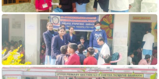 बहराइच। डा. सर्वेश कुमार शुक्ला इंस्टिट्यूट ऑफ नर्सिंग एंड पैरामेडिकल साइंसेज की ओर से मंगलवार को संविलियन विद्यालय चेतरा में बीएससी नर्सिंग व एएनएम की छात्र-छात्राओं द्वारा बच्चों की सेहत जांची गई। नर्सिंग के छात्र-छात्राओं ने नुक्कड़ नाटक, पोस्टर प्रतियोगिता के माध्यम से बच्चों को स्वास्थ्य से संबंधित जानकारियां दी और बच्चों को पोष्टिक आहार वितरण किया गया। इस मौके पर नर्सिंग प्राचार्य हरीश नागर, शिक्षक फूलचंद्र डावरिया, शिक्षिका आंचल सिंह, सौम्या सिंह, सृष्टि, अपूर्वा, साधना, मिनाक्षी, शिल्पी, अमृता, विनीता, शान्ती, पायल, प्रियंका, अनुभव, रमन, आशीष, अमन समेत अन्य छात्र-छात्राएं मौजूद रहें।