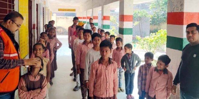 – बच्चों को दवा वितरित करते रेडक्रास चेयरमैन।