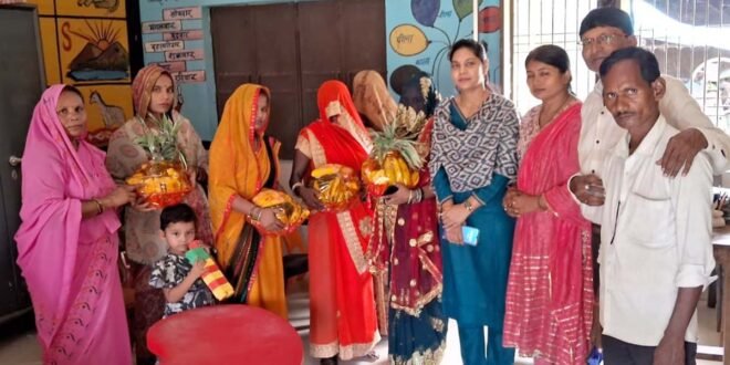 – पोषण पोटली वितरण व गोद भराई कार्यक्रम में भाग लेते लोग।