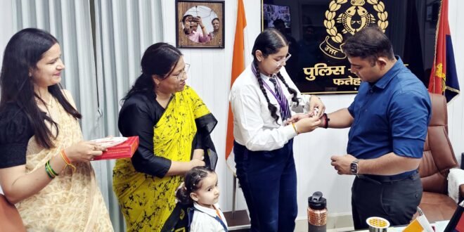 – एसपी की कलाई में राखी बांधती जयपुरिया स्कूल की छात्रा।