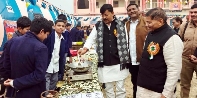 कस्बे के लंका रोड स्थित एक इंटर कॉलेज में शुक्रवार को वीर बाल दिवस पर एक बाल मेला का आयोजन किया गया। जिसका शुभारंभ राष्ट्रीय स्वयंसेवक संघ के प्रांत कार्यवाह रामकेश ने किया। प्रांत संपर्क प्रमुख दुर्गेश, विभाग संघ चालक अशोक, जिला प्रचारक अरुण, बिंदकी क्षेत्र के विधायक जयकुमार सिंह जैकी, जहानाबाद क्षेत्र के विधायक राजेंद्र सिंह पटेल, बाल कल्याण अध्यक्ष अनिल गुप्ता तथा कॉलेज के प्रधानाचार्य बलराम सिंह सहित तमाम लोग मौजूद रहे। विधायक जयकुमार सिंह जैकी व विधायक राजेंद्र सिंह पटेल ने बाल मेले का अवलोकन किया और बच्चों द्वारा लगाए गए विभिन्न प्रकार के काउंटर में खरीदारी भी किया। विधायक श्री जैकी ने बच्चों द्वारा लगाए गए काउंटर में लगे गुब्बारे में निशान लगाया तथा एक काउंटर में पकौड़ा भी तलने का काम किया। उन्होंने स्वयं पकौड़ा खाने के साथ विधायक राजेंद्र सिंह पटेल को भी पकौड़ा खिलाया। बताते चलें कि राष्ट्र धर्म और सनातन संस्कृति की रक्षा के लिए सर्वाेच्च बलिदान देने वाले गुरु गोविंद सिंह महाराज के चार साहिबजादों के बलिदान दिवस को वीर बाल दिवस के रूप में मनाया जाता है।