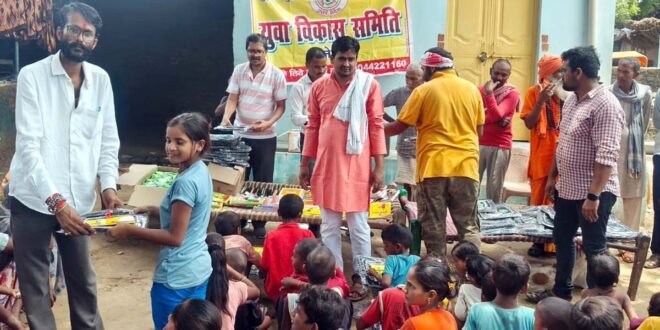 – बाढ़ ग्रस्त इलाके में शिक्षण सामग्री वितरित करते समिति के पदाधिकारी।