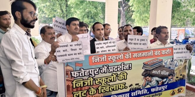 फतेहपुर। युवा विकास समिति के कार्यकर्ताओं ने प्राइवेट स्कूलों की मनमानी फीस वसूल के मुद्दों को जिला मुख्यालय पर प्रदर्शन किया। इस दौरान प्रदेश अध्यक्ष ज्ञानेंद्र मिश्रा के नेतृत्व में एसडीएम को ज्ञापन सौंपा। अध्यक्ष ज्ञानेंद्र मिश्रा ने कहा कि जिले के प्राइवेट स्कूल अभिभावकों से मनमानी फीस वसूल रहे हैं। लेट होने पर जुर्माना भी वसूला जाता है निजी विद्यालय प्रबंधन की ओर से एडमिशन, ट्यूशन, विकास सहित अन्य शुल्क में 15 से 25 प्रतिशत तक बढ़ोतरी की गई है। प्रवेश, बिल्डिग, खेल, पानी, बिजली, चिकित्सा, ट्यूशन फीस के नाम पर नामांकन के समय ही मनमाना वसूली होती है। री-एडमिशन के नाम पर भी पैसा लिया जा रहा है। बच्चों का प्रवेश शुल्क, कापी, किताब, ड्रेस खरीदने में अभिभावक त्राहिमाम कर रहे हैं। यहां तक कि जेनरेटर शुल्क के नाम पर ली जाने वाली राशि में भी बढ़ोतरी की गई है। वहीं जिला प्रशासन भी इस पर मौन है। जिससे नगर के दर्जनों नामी निजी विद्यालयों पर न तो किसी तरह का सरकारी अंकुश है और न ही किसी तरह का दबाव ही। परिणाम हैं कि निजी विद्यालय के संचालक अपनी मर्जी फीस तय करते हैं और अभिभावकों से वसूलते हैं। हर निजी विद्यालय का अपना-अपना फीस है। इस पर किसी तरह का नियंत्रण नहीं दिखता है। जहां तक फीस की बात है तो हर स्कूल में अपने-अपने तरीके से फीस निर्धारित है। कुछ विद्यालयों में केजी से कक्षा आठ तक के लिए 2500 से 3000 रुपये महीना निर्धारित है। तो 8 से ऊपर कक्षा के लिए 3000 से 5000 रुपये तक। इसके अलावा कम्प्यूटर, परिवहन, बिजली आदि के नाम पर भी राशि वसूली जाती है। बिजली के नाम पर 1500 से 2000 तक, आईटी चार्जेस 600, मेंटेनेंस के नाम पर 5000 रुपये वसूल किए जाते हैं। जल्द जिला प्रशासन ऐसी नमी विद्यालयों पर कार्यवाही नही की तो संगठन आंदोलन के लिए तैयार है बड़े स्तर पर जिला के सभी अभियान को कोई इकट्ठा कर आंदोलन किया जाएगा। इस मौके पर संगठन प्रमुख संजय दत्त द्विवेदी, आफताब, जिलाध्यक्ष कंचन मिश्रा, विकास श्रीवास्तव, आनंद अवस्थी, ऋषि बाजपेई, दीप कुमार, दिनेश, संदीप मिश्रा, गणेश तिवारी आदि लोग उपस्थित रहे।