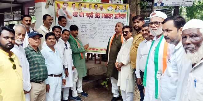 फतेहपुर। कांग्रेस पार्टी द्वारा वोट चोर गद्दी छोड़ का नारा देते हुए लाल बहादुर शास्त्री चौराहे से जिला व शहर कांग्रेस ने हस्ताक्षर अभियान की शुरुआत की गई। जिसमें सभी राहगीरों व वकीलों ने अपने हस्ताक्षर कर मौजूदा भाजपा सरकार का विरोध दर्ज किया। हस्ताक्षर अभियान में जिलाध्यक्ष महेश द्विवेदी ने पत्रकारों से कहा कि जिस प्रकार भाजपा निर्लज्जता के साथ जीएसटी कम कर उसको उपहार बता रही बहुत ही शर्मनाक है। उन्होंने कहा कि इसके पहले जो एक सौ सत्ताईस लाख करोड़ रुपया जीएसटी से वसूला गया उसका क्या होगा। ये तो सरासर लूट है। शहर अध्यक्ष मो0 आरिफ गुड्डा ने कहा कि वोट चोरी खुलने से भाजपा डरवश जीएसटी कम कर मुंह छिपाने का प्रयास कर रही है परंतु देश का बच्चा बच्चा यह जान चुका है कि देश में चोरों की सरकार है। उन्होंने आगे कहा कि यह भ्रष्ट सरकार अपना कार्यकाल कतई पूरा नहीं कर पाएगी एवं जिस प्रकार मोदी ने चुनाव आयोग को कब्जे में लेकर उसे पंगु बनाते हुए उसकी मर्यादा भंग की है। ये भविष्य में देश का काला इतिहास होगा। अभियान में शेख एजाज अहमद, कलीम उल्ला, देवी प्रकाश दुबे, सैयद सहाब अली, अनुराग मिश्रा, ओम प्रकाश गिहार, राजू लोधी, आदित्य श्रीवास्तव, कल्लू कोरी, ओम प्रकाश कोरी, नौशाद अहमद, अकरम काले, बसीर अहमद, राजीव लोचन निषाद, मो. रमजान, मो. असलम, अरुण जायसवाल, ओम प्रकाश कोरी, मनोज घायल, डॉ अब्दुल हमीद, नसीम अंसारी, अजय बच्चा, कौशल कुमार शुक्ला, सलीम खान, उस्मान बेग, निजाम उद्दीन, मो हफीज, अमीरूज्जमा खान, अब्दुल समद, अजीम उल्ला आदि लोग मौजूद रहे।