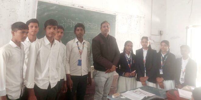 सिरसागंज:- नगर के प्रतिष्ठित विद्यालय श्री एम डी जैन इंटर कॉलेज, सिरसागंज में विद्यालय के प्रधानाचार्य नीरज कुमार जैन एवं प्रवक्ता अश्वनी कुमार जैन के संयोजन में विद्यालय के कक्षा 11 के नागरिक शास्त्र के विद्यार्थियों के मध्य संविधान क्विज का आयोजन किया गया।