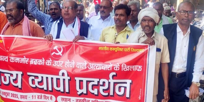 पार्टी ने इस बात पर गहरी चिंता व्यक्त की है कि देश के अंदर दलित महिलाओं, धार्मिक, अल्पसंख्यक को निशाना बनाया जा रहा है। जनपद के दलित हरिओम बाल्मीकि की रायबरेली में पीट पीटकर हत्या, हरियाणा के दलित आईपीएस अधिकारी पूरनलाल की प्रताड़ना से आत्महत्या, भारत के मुख्य न्यायाधीश बीआर गवई पर जूता फेंकने की घटना ने पूरे देश को झकझोर दिया है। लखनऊ की बंथरा कस्बे की 11 वीं की दलित छात्रा से गैंगरेप शर्मसार करने वाली घटना है। पार्टी ने प्रदेश व देश की सरकार का दलित विरोधी रवैया पर गहरी चिंता जताई है। मांग की है कि देश में हो रही जातिगत हत्याओं पर रोक लगाई जाए। प्रदेश में कानून व्यवस्था को ठीक किया जाए। देश में लोकतंत्र और संवैधानिक मूल्यों की रक्षा की जाए। धर्म के आधार पर देश को तोड़ने बांटने की साजिश को रोकने फतेहपुर के दलित युवक हरिओम बाल्मीकि की हत्या की न्यायिक जांच कराने, पीड़ित परिवार को एक करोड़ मुआवजा देने व एक व्यक्ति को सरकारी नौकरी, सामाजिक सुरक्षा प्रदान किया जाए। हरियाणा के दलित परिवार के आईपीएस अधिकारी पूरनलाल की आत्महत्या की उच्च स्तरीय जांच, भारत के मुख्य न्यायाधीश बीआर गवई पर जूता फेंकने वाले के खिलाफ कानूनी कार्रवाई की मांग की गई। पार्टी कार्यकर्ताओं ने स्थानीय डाक बंगले के पास धरना दिया। जिला सचिव राम प्रकाश के नेतृत्व में प्रदर्शन करके नारे लगाते हुए मांग पत्र दिया। प्रदर्शन में राज्य कार्यकारिणी सदस्य मोतीलाल एडवोकेट, राज्य परिषद सदस्य रामचंद्र, जिला सह सचिव रामकृष्ण हेगड़े, पूरनलाल जिला काउंसिल सदस्य राम अवतार सिंह, राधेरमण पांडेय, नोखेलाल, कयामुद्दीन, शिवनारायण साहू, जगदेव, गयालाल, नेम सिंह एडवोकेट, राम सुमेर सिंह एडवोकेट, अतुल कुमार एडवोकेट, शिवचरण, विनोद कुमार एडवोकेट, जगन्नाथ, कामता प्रसाद लोग़ उपस्थित रहे।