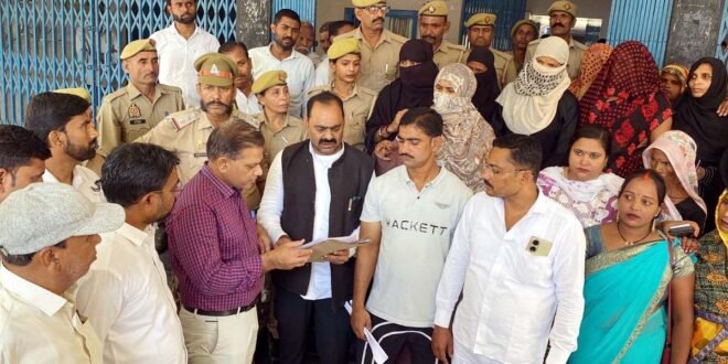 – डीएम को शिकायती पत्र देने के लिए खड़े सनगांव के ग्रामीण।
