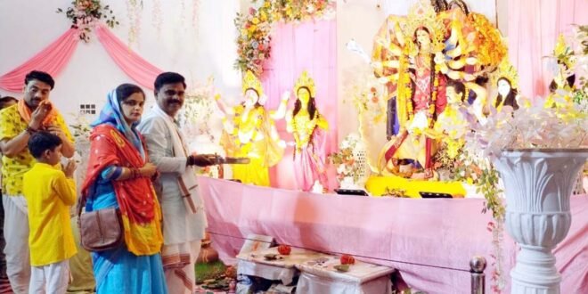 – चौधराना मुहल्ले के दुर्गा पण्डाल में पूजा-अर्चना करते भक्त।
