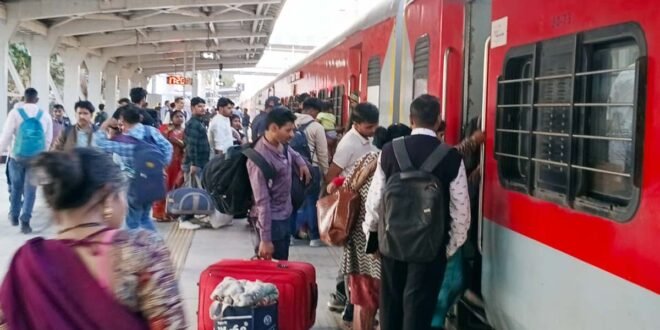 – रेलवे स्टेशन में टेªन में चढने की कोशिश करते यात्री।