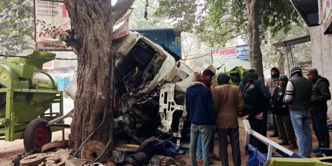 शीशम के पेड़ से टकराकर क्षतिग्रस्त ट्रक का केबिन।