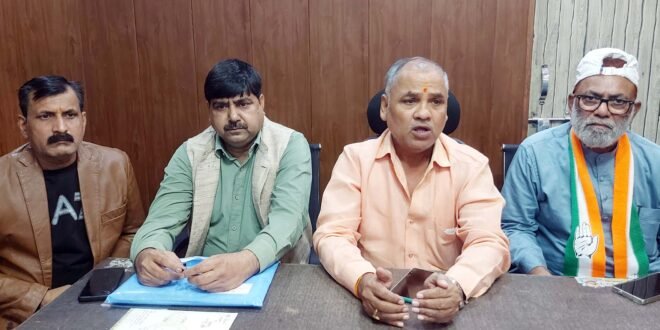 – पत्रकारों से बातचीत करते कांग्रेस जिलाध्यक्ष महेश द्विवेदी व शहर अध्यक्ष मो0 आरिफ गुड्डा।