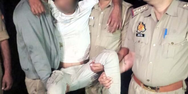 – घायल लुटेरे को लेकर जाती पुलिस टीम।