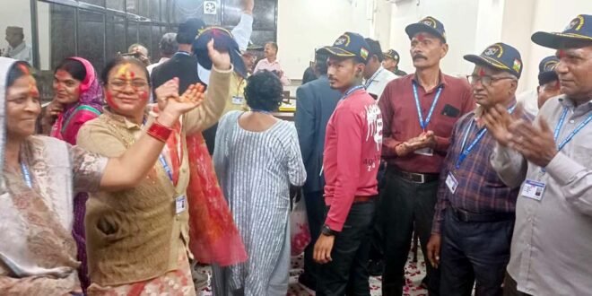 – एक-दूसरे को अबीर गुलाल लगाकर पर्व की बधाई देते पूर्व सैनिक संगठन के पदाधिकारी।