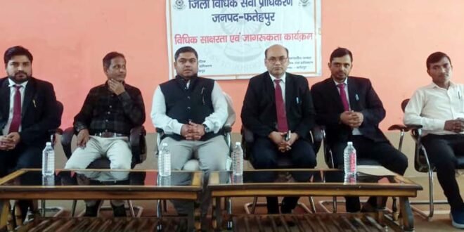 फतेहपुर। जिला विधिक सेवा प्राधिकरण के सचिव पलाश गांगुली ने ठा0 युगराज सिंह लॉ कॉजेज में विधिक साक्षरता शिविर का आयोजन किया। शिविर में अमित तिवारी एवं सहायक अशोक कुमार ने प्रतिभाग किया। विधिक साक्षरता शिविर प्राचार्य विनय तिवारी की उपस्थिति में हुआ। शिविर में विधि छात्र एवं छात्राओं को विधिक जानकारी देते हुए उच्चतम न्यायालय एवं उच्च न्यायालय द्वारा प्रतिपादित विधिक सिद्धांत समझाए गए। इसके अलावा निर्धन महिलाओं, बच्चों एवं विकलांगों के हितधारक कानूनी जानकारी प्रदान की। शिविर में करीब 80 छात्र एवं छात्राओं ने प्रतिभाग किया। शिविर में अध्यक्ष अमित तिवारी लीगल एड डिफेन्स काउन्सिल द्वारा मिलने वाली योजनाओ एवं उनके टीम द्वारा आम जनमानस को दिये जाने वाली विधिक सहायता के सम्बन्ध में विस्तृत जानकारी दी गयी। जैसे कोई भी व्यक्ति जिला करागार में बन्द है और उनके वाद में पैरवी हेतु अधिवक्ता नहीं है तो उनके वाद में पैरवी/जमानत आदि के लिये अधिवक्ता द्वारा विधिक सहायता प्रदान किया जाता है। इसी क्रम में ऐसे व्यक्ति जो अनुसूचित जाति-अनुसूचित जन जाति, महिलाओ, दृष्टि बाधित एवं जिनकी वार्षिक आय तीन लाख रुपये से कम है को लीगल एड डिफेन्स काउन्सिल सिस्टम द्वारा बचाव पक्ष अभियुक्त/अभियुक्ता की ओर से निःशुल्क विधिक सहायता हेतु प्रार्थना पत्र देने पर लीगल एड डिफेन्स काउन्सिल द्वारा सेवा उपलब्ध करायी गयी।