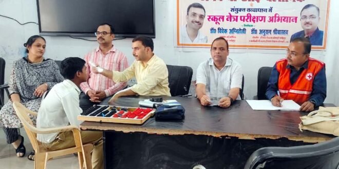 फतेहपुर। इंडियन रेडक्रास सोसाइटी व जगदंबा आई क्लीनिक के संयुक्त तत्वावधान में राजकीय इंटर कॉलेज में नेत्र परीक्षण अभियान चलाया गया। अभियान का शुभारंभ विद्यालय के प्रधानाचार्य रमाकांत सिंह ने बच्चों को अपनी दृष्टि को बेहतर रखने व बच्चों को मोबाइल का न करने हेतु जागरूक कर किया।