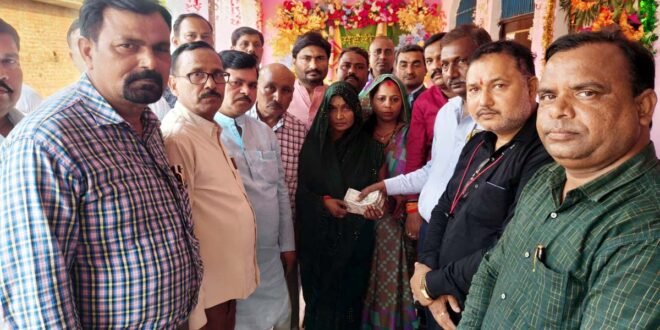– मृतक शिक्षामित्र के परिवार को आर्थिक मदद देते संगठनों के लोग।