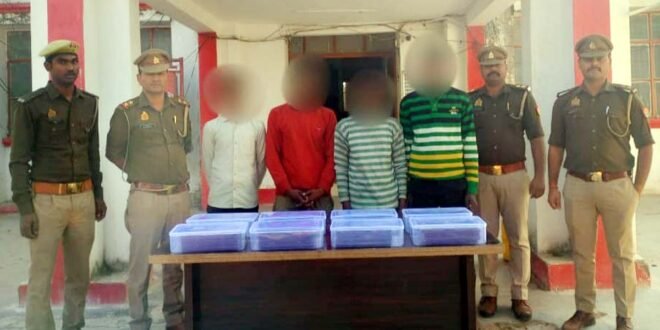 खागा/फतेहपुर। कोतवाली क्षेत्र के खासमऊ कम्पोजिट विद्यालय में हुई चोरी का खुलासा करते हुए पुलिस ने चार आरोपियों को गिरफ्तार कर जेल भेज दिया। पुलिस ने पकड़े गए लोगों के पास चोरी के 43 टेबलेट बरामद किया है। जानकारी के अनुसार बीती 28 सितंबर को खासमऊ कम्पोजिट विद्यालय का ताला तोड़ कर अज्ञात चोरों ने 43 टेबलेट चोरी किया था। इसका मुकदमा एक अक्टूबर को खागा कोतवाली में पुलिस ने प्रधानाध्यापक अतीक अहमद सिद्दीकी निवासी खखरेरू की तहरीर के आधार पर अज्ञात चोरों के नाम पंजीकृत किया था। अपर पुलिस अधीक्षक महेंद्र पाल सिंह ने बताया कि पुलिस अधीक्षक अनूप सिंह के निर्देश पर अपराधियों के खिलाफ चलाए जा रहे अभियान के अंतर्गत महिचा मंदिर पुलिस चौकी इंचार्ज राहुल पाण्डेय अपराधियों की सुरागरसी में लगे थे। बृहस्पतिवार को चौकी इंचार्ज की टीम ने हाईवे से खासमऊ गांव जाने वाली सड़क पर करीब सौ मीटर अंदर खासमऊ निवासी अभय सिंह, अभिषेक, मुकेश उर्फ बम-बम, शिवा उर्फ लल्लू को संदिग्ध अवस्था देखकर रोका। पुलिस पकड़ में आये चारों युवकों ने अपना जुर्म कुबूल कर लिया। पुलिस ने पकड़े गए युवकों की निशानदेही पर विद्यालय से चोरी हुए 43 टेबलेट बरामद कर सभी को जेल भेज दिया।