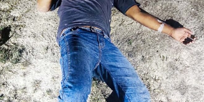 – जमीन पर पड़ा पुलिस मुठभेड़ में घायल इनामिया अभियुक्त।