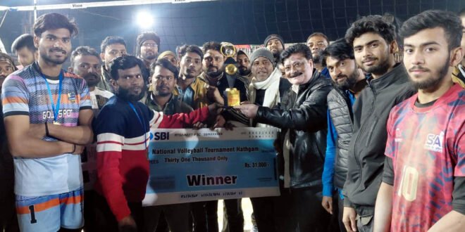खागा, फतेहपुर। नेशनल वालीबाल टूर्नामेंट हथगाम की ओर से आयोजित वॉलीबॉल प्रतियोगिता के फाइनल में कमल मेडिकल स्टोर के नाम से गोरखपुर की टीम ने गुड्डू खाद सेंटर बनारस की टीम को अंतिम सेट में 11-6 से हरा दिया। मैच बेहद रोमांचक रहा। एक-एक प्वाइंट बनाने में दोनों टीमों को जमकर पसीना बहाना पड़ा। पहला सेट जहां गोरखपुर ने जीता, वहीं दूसरे सेट में वापसी करते हुए बनारस ने जीत दर्ज की लेकिन फाइनल सेट में बनारस पीछे रह गई और फाइनल की ट्रॉफी गोरखपुर के नाम हो गई। लगभग आधी रात को फाइनल खेला गया लेकिन बड़ी संख्या में दर्शक मौजूद रहे जो खिलाड़ियों की हौसला अफजाई कर रहे थे। पुरस्कार वितरण समाजसेवी सैयद मोहसिन हसन के हाथों किया गया। विजेता टीम के कप्तान मो. शमीम ने ट्रॉफी ग्रहण की। विजेता टीम को 31 हजार रुपए तथा उपविजेता टीम को 21 हजार रुपए नगद दिए गए। विजेता टीम के खिलाड़ी रेहान मैन ऑफ़ द मैच रहे जबकि उपविजेता टीम के खिलाड़ी आदित्य पांडेय मैन ऑफ द टूर्नामेंट रहे जिन्हें आजम कमर की ओर से मिक्सर ग्राइंडर मशीन प्रदान की गई। इस टूर्नामेंट में मोहसिन हसन की ओर से काफी सहयोग किया गया। अन्य दुकानदारों ने भी भरपूर सहयोग किया। लाइट की व्यवस्था मो.शादाब ताहिर ने की। यह वॉलीबॉल टूर्नामेंट नगर के सहयोग से आयोजित हुआ। टीमों के नाम भी नगर के विभिन्न व्यापारिक प्रतिष्ठानों के नाम से रखे गए थे। सैयद मोहसिन हसन, आसिफ पप्पू, हफीजुल हसन, सैयद रेहान अहमद, अतीक अहमद, पूर्व चेयरमैन महेंद्र सिंह यादव आदि लोगों के नेतृत्व में अंतिम दिन प्रदेश स्तर की वॉलीबॉल की टीमों ने भाग लिया। मौके पर इंस्पेक्टर दुर्गेश प्रसाद गुप्त, सब इंस्पेक्टर राज बहादुर यादव, दीपक साहू सभासद, राकेश सिंह, कमल नयन साहू, प्रदीप शुक्ला, सलमान, दारा यादव, नफीस प्रधान, नग्गन, सुल्तान, अनवारूल हक, इसरार पहलवान, मोहम्मद शहजादे, शहाबुद्दीन, मुशीर अहमद साबिर अली सहित तमाम लोग रहे।
