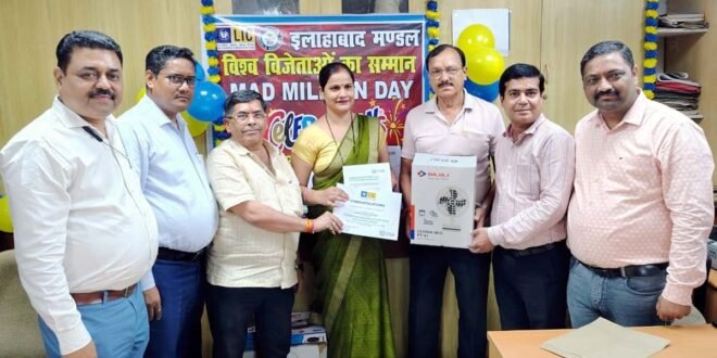 – अभिकर्ताओं को प्रशिस्त पत्र देकर सम्मानित करते शाखा प्रबंधक।
