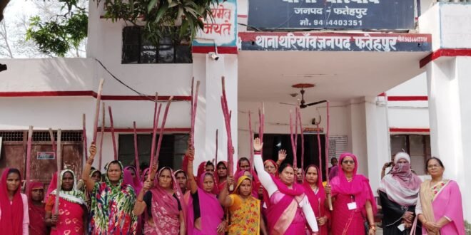 फतेहपुर | जनपद के थरियांव थाने पर शुक्रवार को उस समय भारी हलचल देखी गई, जब गुलाबी गैंग लोकतांत्रिक की अध्यक्ष हेमलता पटेल के नेतृत्व में गुलाबी वेशभूषा में सैकड़ों महिलाएं थाने पहुंचीं और जोरदार प्रदर्शन किया। औराई गांव की युवती खुशबू की संदिग्ध परिस्थितियों में हुई मौत को लेकर महिलाओं ने आक्रोश जताते हुए त्वरित न्याय और दोषियों पर सख्त कार्रवाई की मांग उठाई।