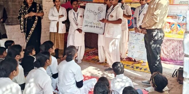 – बच्चों को स्वच्छता के टिप्स देतीं नर्सिंग छात्राएं।