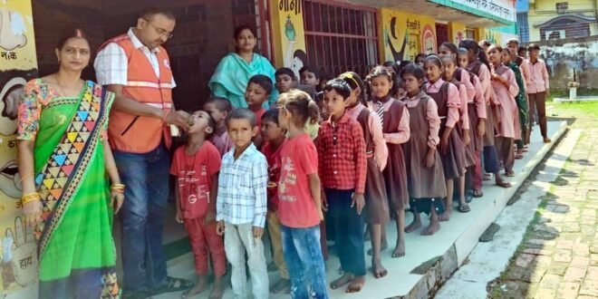 – बच्चों को होम्योपैथिक दवा खिलाते रेडक्रास चेयरमैन।