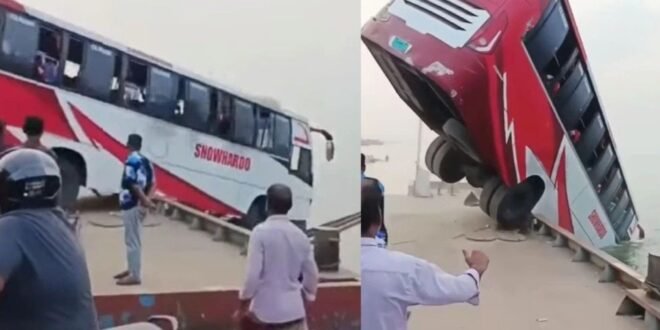 बांग्लादेश में एक यात्री बस पद्मा नदी में गिर गई। हादसे में 25 लोगों की मौत हो गई है। 11 यात्रियों ने तैरकर अपनी जान बचा ली। बस में करीब 40 लोग सवार थे। हादसा बुधवार देर शाम को हुआ। हादसे के दौरान दावा किया गया था कि सिर्फ 2 लोगों की मौत हुई है, लेकिन आज सुबह मृतकों की संख्या बढ़ गई। मीडिया रिपोर्ट के अनुसार, हादसा राजबाड़ी जिले में दाउलादिया टर्मिनल पर हुआ। बस फेरी (बड़ी नाव) पर चढ़ रही थी। इसी दौरान ड्राइवर का कंट्रोल छूट गया और बस सीधे नदी में जा गिरी। बांग्लादेश में बसों और गाड़ियों को नदी पार कराने के लिए फेरी का इस्तेमाल होता है। यह एक बड़ी नाव या जहाज जैसा होता है। प्रधानमंत्री तारिक रहमान ने रेस्क्यू आपरेशन की जानकारी ली और जांच के आदेश दिए।