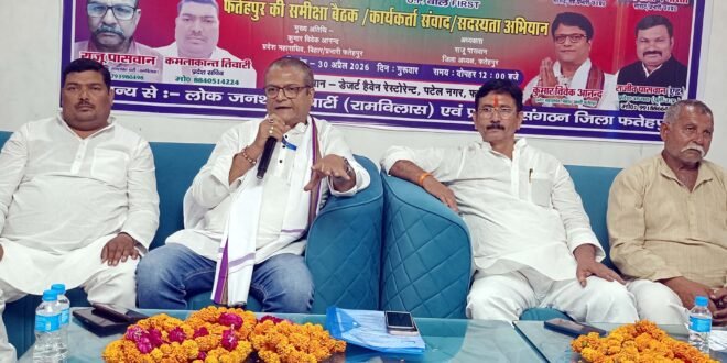 फतेहपुर। लोकजन शक्ति पार्टी रामबिलास उत्तर प्रदेश विधानसभा चुनाव 2027 में प्रदेश की सभी सीटों पर चुनाव लडने को पूरी तैयारी करेगी। पार्टी का बिहार में एनडीए के साथ गठबंधन है। यूपी में गठबंधन होता है तो पार्टी सम्मानजन सीटो पर समझौता कर चुनाव लड़ने का काम करेगी। उक्त बातें लोक जनशक्ति पार्टी रामविलास के प्रदेश महासचिव बिहार एव जनपद प्रभारी कुमार विवेक अनान्द के पत्रकारों से बातचीत में कही। गुरुवार को शहर के पटेलनगर स्थित एक होटल में लोक जनशक्ति पार्टी रामविलास की संगठनात्मक समीक्षा बैठक एवं कार्यकर्ता संवाद का आयोजन जिलाध्यक्ष राजू पासवान की अध्यक्षता में आयोजित की गई। जिसमें मुख्य अतिथि के रूप में बिहार राज्य के प्रदेश महसचिव कुमार विवेक अनान्द ने शिकरत की। इस दौरान कार्यकर्ताओ से प्रदेश में होने वाले 2027 के विधानसभा चुनाव के लिये सभी विधानसभा सीटों पर बूथ स्तर तक संगठन को मजबूत करने एवं स्थानीय समस्याओं के मुद्दों पर जनता से जुड़ने का आह्वान किया। समीक्षा बैठक के उपरांत संगठन को मजबूती देने के लिये कार्यवाहक जिलाध्यक्ष के रूप में शिवबहादुर पासवान, अल्पसंख्यक प्रकोष्ठ के जिलाध्यक्ष नसीम खान व किसान प्रकोष्ठ जिलाध्यक्ष इरफान खान को नियुक्त किया गया। किसान प्रकोष्ठ के राष्ट्रीय अध्यक्ष धर्मेंद्र मिश्रा एडवोकेट द्वारा समाजवादी पार्टी समेत अन्य दलों से आये हुए आधा सैकड़ा लोगों को लोजपा की सदस्यता ग्रहण कराई गई। माला पहनाकर स्वागत किया गया। पत्रकारों से बातचीत करते हुए जनपद प्रभारी कुमार विवेक आनंद ने बताया कि उत्तर प्रदेश प्रभारी एव सांसद अरुण भारती के निर्देशन पर पूर्वी यूपी के सभी जिले में एक साथ समीक्षा बैठक आयोजित की जा रही है। जिसमे कार्यकर्ताओ से संवाद कर उनकी समस्याओं के निराकरण के साथ ही विधानसभा चुनाव 2027 के लिए संगठन को मजबूत कर प्रदेश की सभी सीटों पर बूथ स्तर तक पहुंच बनाना है। लोजपा सभी सीटों पर सवेदारी करेगी बिहार की तर्ज पर एनडीए गठबंधन करती है तो पार्टी सम्मानजनक सीटांे पर समझौता करेगी एवं पूरी ताकत से चुनाव लड़ने का काम करेगी। इस मौके पर रमेश पासवान, राजोल दुबे, सिंघम दुबे, शिवसागर लोधी, नरेश, धीरेंद्र अवस्थी, घूरेलाल पासवान, कमलाकांत तिवारी आदि रहे।