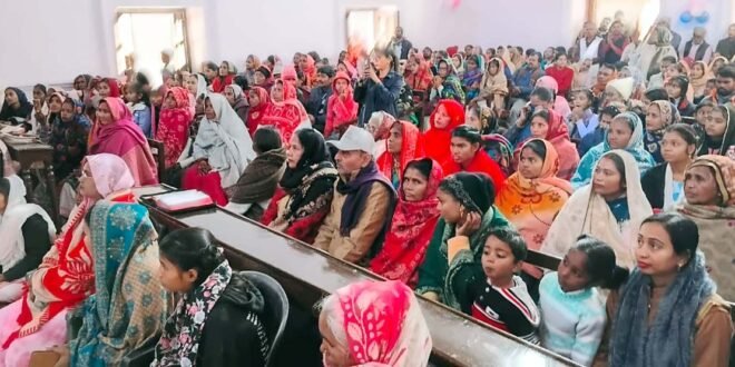 ) गिरजाघर में आयोजित प्रार्थना सभा में भाग लेते इसाई समाज के लोग।