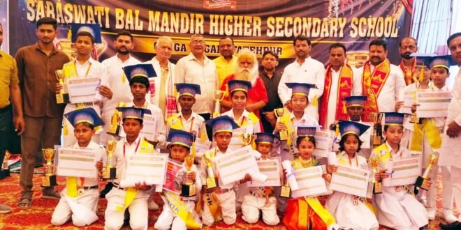 फतेहपुर। सरस्वती बाल मंदिर हायर सेकेंडरी स्कूल गंगानगर में मेधा अलंकार एवं अभिभावक सम्मान समारोह हर्षाेल्लास के साथ संपन्न हुआ। कार्यक्रम की अध्यक्षता दुर्गा मंदिर के संत ने की। मुख्य अतिथि के रूप में जिला बार एसोसिएशन के नवनिर्वाचित अध्यक्ष बाबू सिंह यादव और नवनिर्वाचित महामंत्री अनुराग नारायण मिश्रा उपस्थित रहे। विशिष्ट अतिथि में वरिष्ठ साहित्यकार मधुसूदन दीक्षित, भाजपा के जिला महामंत्री नीरज सिंह उपस्थित रहे। कार्यक्रम का शुभारंभ मां सरस्वती की वंदना से आरंभ हुआ। कार्यक्रम में कुल 90 मेधावियों को सम्मानित किया गया। 125 ऐसे अभिभावको को भी पुरस्कृत किया गया जिनके बच्चे पूरे वर्ष भर में एक भी दिन विद्यालय से अनुपस्थित नहीं हुए। परिणाम की दृष्टि से सीनियर वर्ग में निकुंज 7बी ने 99.79 प्रतिशत अंक पाकर विद्यालय टॉप किया। जबकि 99 प्रतिशत अंक पाकर विराट 8ए द्वितीय स्थान पर रहे। 98.5 प्रतिशत अंक पाकर पिहू 9ए ने तृतीय स्थान प्राप्त किया। इसी प्रकार प्राथमिक वर्ग में अरूफ केजी ने 98.5 प्रतिशत अंक पाकर आल ओवर टॉप किया जबकि रक्षा 1बी 98 प्रतिशत अंक पाकर द्वितीय स्थान में रही और आलोक 97 प्रतिशत पाकर तृतीय स्थान में रहे। अतिथियों ने विद्यालय के पठन-पाठन व अनुशासन की भूरि भूरि प्रशंसा की। विद्यालय के प्रबंधक राकेश कुमार त्रिवेदी ने कहा कि विद्यालय से निकले हुए अनेक विद्यार्थी बहुत अच्छे-अच्छे पदों में सेवाएं दे रहे हैं इससे यह प्रमाणित है कि हमारा विद्यालय अंग्रेजी माध्यम से उत्कृष्ट शिक्षा देते हुए अच्छे संस्कार देने में अव्वल दर्जे पर है। इस अवसर पर विद्यालय के प्रधानाचार्य मोहित, शिवपुरम शाखा के प्रधानाचार्य क्रमशः धीरेंद्र व सक्षम सहित पूरा स्टाफ कार्यक्रम के सकुशल संपादन में जी जान से डटा रहा।