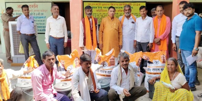 – बाढ़ पीड़ितों को राहत सामग्री वितरित करते विधायक राजेन्द्र सिंह पटेल।