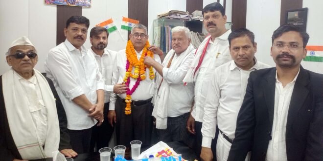 – बार के नवनिर्वाचित अध्यक्ष का माला पहनाकर स्वागत करते अधिवक्ता।