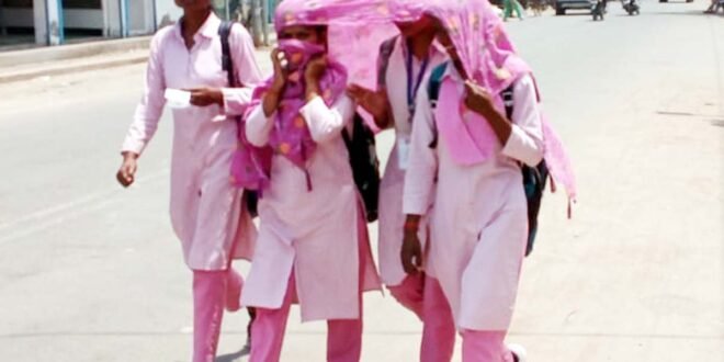 – धूप से बचने के लिए दुपट्टे से सिर ढके स्कूली छात्राएं।