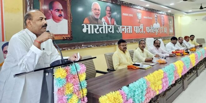 फतेहपुर। शनिवार को जेल रोड स्थित भाजपा जिला कार्यालय में स्नातक एमएलसी चुनाव को लेकर योजना बैठक आयोजित हुई, जिसमें मुख्य अतिथि के रूप में उपस्थित क्षेत्रीय महामंत्री सन्तविलास शिवहरे ने संबोधित किया। श्री शिवहरे ने कहा कि हमारे पास पूर्व व वर्तमान पदाधिकारियों के साथ ही मोर्चों व प्रकोष्ठों के बड़ी संख्या में सेवानिष्ठ कार्यकर्ता हैं जिनके माध्यम से हम व्यवस्थित रूप से स्नातकों का फार्म भरकर जमा करने की जिम्मेदारी निभायेंगे। प्रत्येक शक्ति केंद्र में हमें कम से कम 100 फार्म भरने हैं। बैठक की अध्यक्षता कर रहे जिलाध्यक्ष मुखलाल पाल ने उपस्थित जिला संयोजक व विधानसभा संयोजकों के साथ ही उपस्थित सभी पदाधिकारियों को जिम्मेदारी सौंपी गई। श्री पाल ने कहा कि हमारे कार्यकर्ता विचारवान उर्जावान व कर्तव्यनिष्ठ हैं। निश्चित रूप से वह अधिक से अधिक स्नातकों को एमएलसी चुनाव में वोटर बनायेंगे। कार्यक्रम का संचालन जिला महामंत्री व एमएलसी चुनाव जिला संयोजक उदय लोधी ने किया। इस अवसर पर पुष्पराज पटेल, सह संयोजक आचार्य कमलेश योगी, विधानसभा अयाह शाह संयोजक प्रवीण सिंह, सदर संयोजक अभिषेक शुक्ला, हुसैनगंज संयोजक आरपी मौर्य, अर्चना त्रिपाठी, अपर्णा सिंह गौतम, कुलदीप भदौरिया, विमलेश पांडेय, अमित शिवहरे, विजय प्रताप सिंह, स्वरूप राज सिंह जूली, अतुल त्रिवेदी, मनोज गांधी, प्रसून तिवारी, सुधांशु श्रीवास्तव, डॉ शिवप्रसाद त्रिपाठी, विनोद पांडेय, संजय हांडा, शिवपूजन तिवारी, साहिल शर्मा, विनोद भारती, राजेश द्विवेदी, अरविंद गुप्ता, सुमित तिवारी, अभिषेक श्रीवास्तव, विनोद गौतम, राजू पाल बिलंदा, अवनीश मौर्य सहित मंडल अध्यक्ष, मंडल संयोजक व सहसंयोजक उपस्थित रहे।