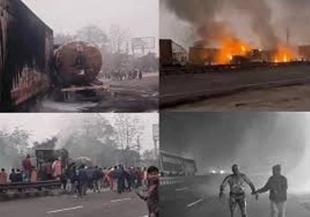 चश्मदीद हेमराज ने कहा- हम हाईवे के एक रेस्टोरेंट पर आराम करने रुक गए थे। गैस सिलेंडर से भरे ट्रक का ड्राइवर खाना खा रहा था। तभी पीछे से आए एक टैंकर ने ट्रक को टक्कर मार दी। ट्रेलर में दो लोग थे। उसमें से एक बाहर निकल गया। वहीं दूसरा गाड़ी में ही फंस गया। उसे आसपास के लोगों ने बचाने की कोशिश की, लेकिन आग पकड़ने से लोग उसे बचा नहीं पाए। वहीं गैस सिलेंडरों ने भी आग पकड़ ली और धमाके शुरू हो गए।